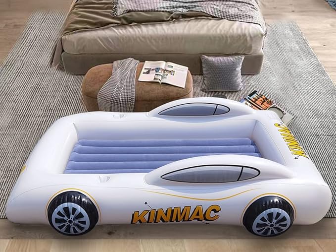 • 🏠🚗【Upgrade Racecar Inflatable Toddler Travel Bed】KINMAC inflatable toddler travel bed is a fun, colorful racecar artwork, this racecar toddler bed resembles a racetrack-ready car with a realistic car pattern style, like a real racing car model, as well as a 3D pattern, smooth car lines and realistic decals that accentuate the stylish car windows, black and white wheels will excite any little racer! The toddler bed collection is the perfect collection for any racing fan’s room. COOL DESIGN!
