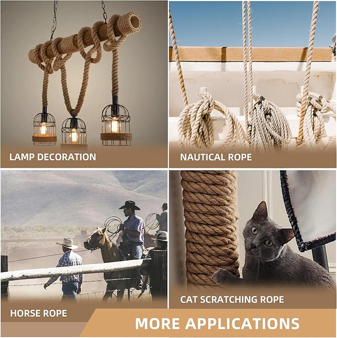 • 【Wide Application Rope】1) Indoors: rope for crafts, cat scratching posts, landscaping, home decor, vintage room decor, stairwell decor,braided hemp rope etc. 2) Outdoors: nautical rope,hemp rope for deer scrape,tug of war rope,Hanging flower baskets, gardening, swing bed hanging, camping, seawall fencing, bollards on docks, outdoor bar projects, wall hangings and other scenes