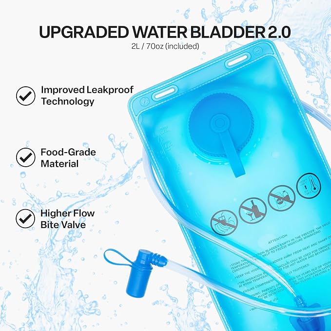 • EFFICIENT HYDRATION SYSTEM: This 18L hydration backpack includes an UPGRADED 70 oz / 2-LITER water bladder made of FOOD-GRADE PEVA material, along with a high-flow bite valve. The mouthpiece cover protects the bite valve against dirt and damage. The 2-LITER bladder is replaceable and supports up to 3-LITER / 100 oz.