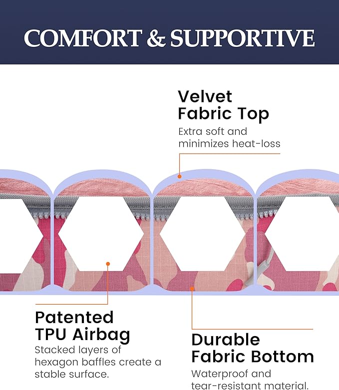 • HOME-LIKE COMFORT: Thoughtfully crafted to bring the comfort of home wherever you go! It features a 100% cotton velvet top, a supportive TPU airbag, and a waterproof rip-stop fabric base. The velvet top is skin-friendly and offers superior softness, while minimizing heat loss to keep you warm. Combining durability with exceptional comfort, our mattress is perfect for all seasons