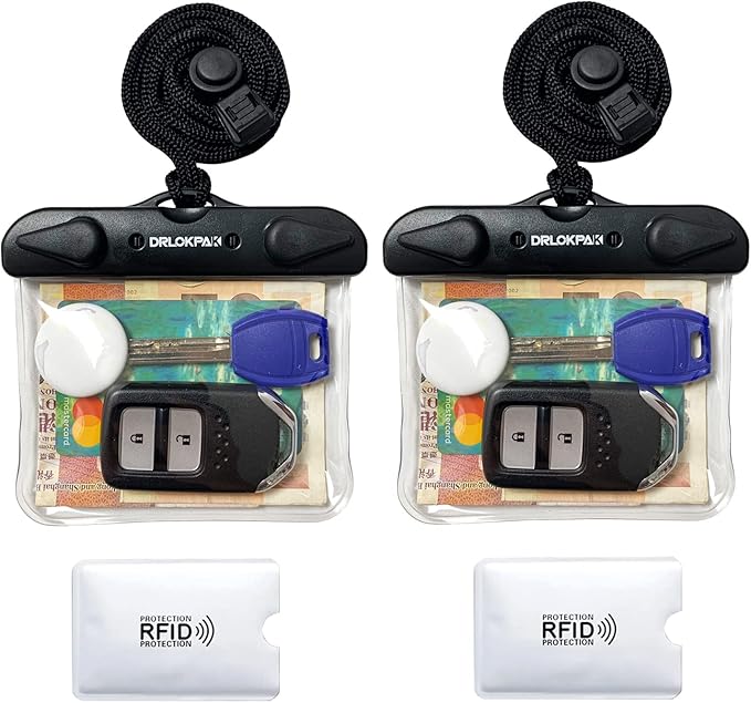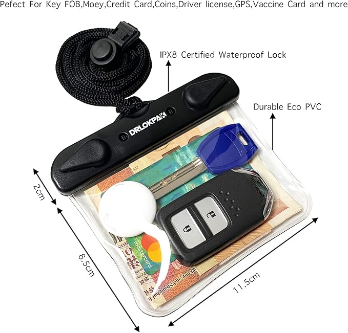 • 1 IPX8 Submersible Waterproof Wallet Waterproof to 32 Feet (10m). It can protect your car key FOB, cruise ship cards,credit cards,GPS, cash, coins, ID, earbuds, palm phone, driver license, fishing license from water, rain, dirt and scratch. Perfect for surfing, swimming, snorkeling, kayaking, tubing, rafting, stand up paddle boarding, boating, skiing, beaching, sailing and more watersports.