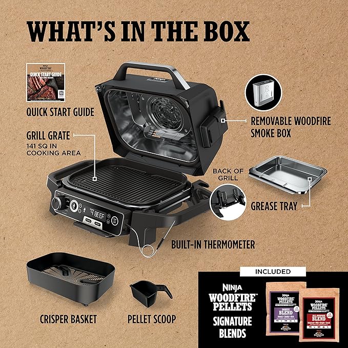 • WHAT'S INCLUDED: 141-sq-in. nonstick grill grate, crisper basket, built-in thermometer, pellet scoop, Ninja Woodfire Pellets Robust Blend and All-Purpose Blend Starter Packs, & Quick Start Guide with 15 recipes.