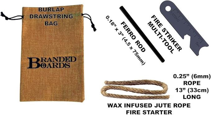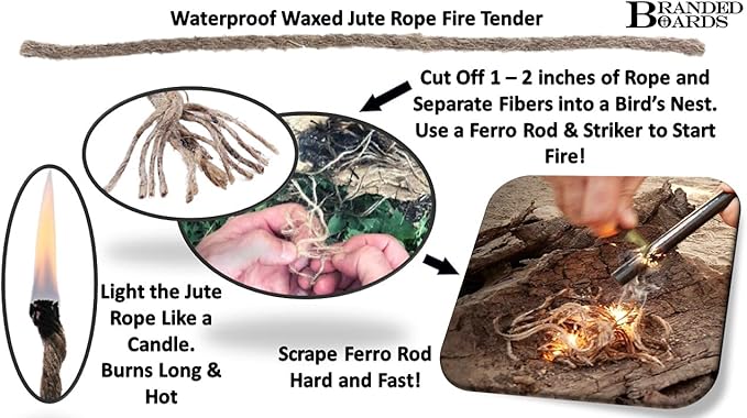 • With the Ferrocerium Rod, Multi Tool Fire Striker and Waterproof Waxed Jute Rope Tender you can start a fire anywhere and under any conditions, Rain, Snow, Cold, Hot or Windy.