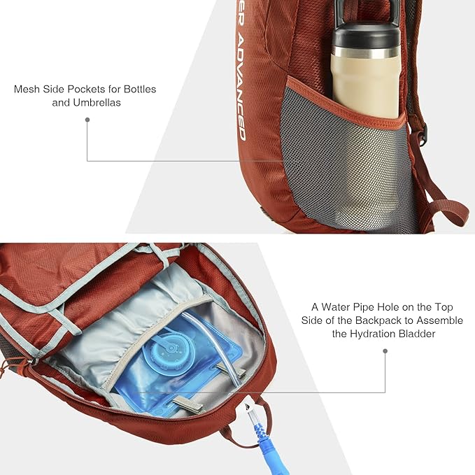 • ROMMY 20L CAPACITY: Designed with 20L capacity, the packable backpack has one main zipped compartment, one front pocket and two side pockets keep your things organized and separated. And a water pipe hole on the top side of the backpack to assemble the water bag system.(NOT come with a hydration bladder)