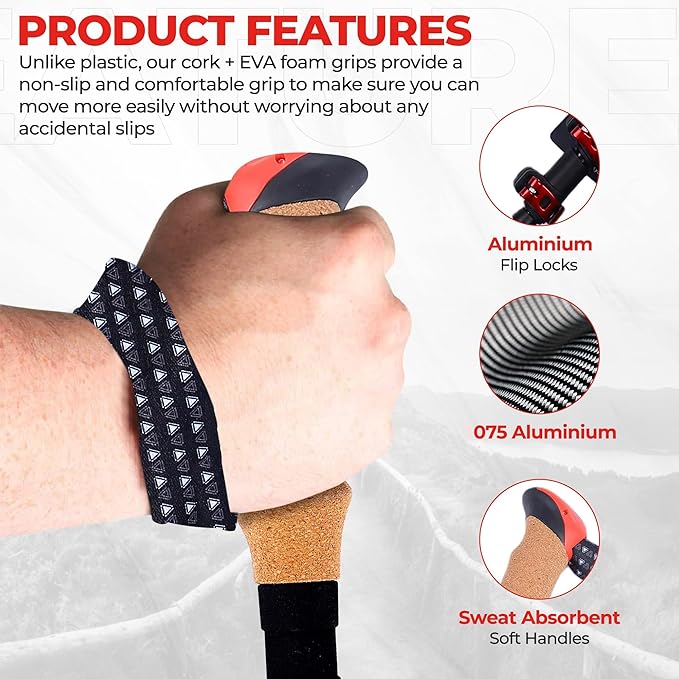 • π‚πŽπŒπ…πŽπ‘π“π€ππ‹π„ π‚πŽπ‘πŠ π†π‘πˆπ: Our hiking sticks come with a natural cork and EVA handles that provide a firm and comfortable grip in your hands. This folding walking stick has anti slip grip that ensures the right fit for a wide range of hand sizes for men and women.