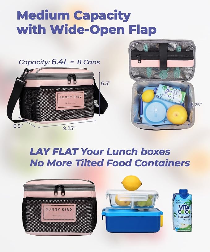 SUNNY BIRD Insulated Lunch Bag with Foldable and Leakproof Design, Thermally Insulated, Shoulder Strap for Women, Men and Teen (Pink 002)