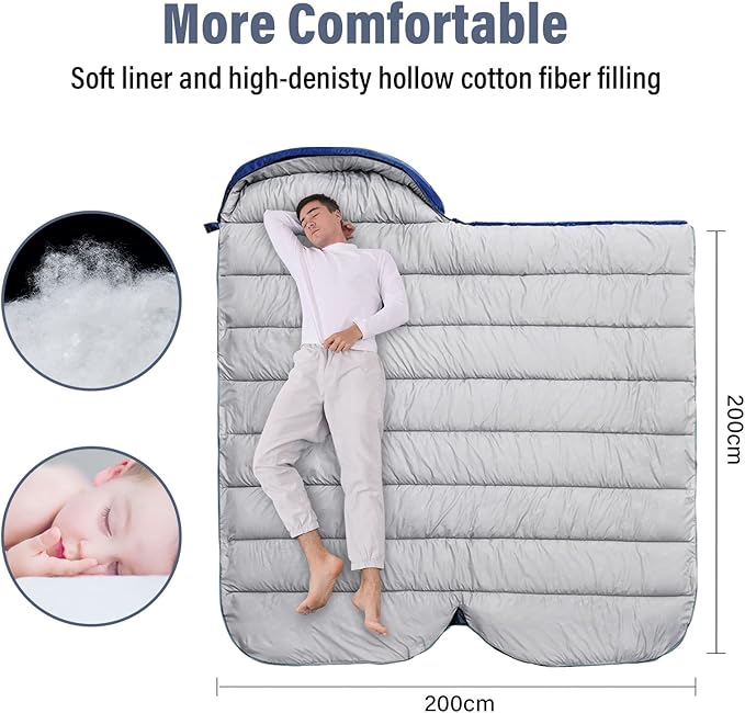 • 【WARM AND COMFORTABLE】The XXL 5.5 Lbs sleeping bag can be used for 4 seasons. It is suitable for use at a comfort temperature of 50°F (10°C), with an extreme temperature of 41°F (5°C). The sleeping bag is equipped with Velcro and a drawstring. I hope BISINNA's sleeping bag can accompany you to sleep at ease.