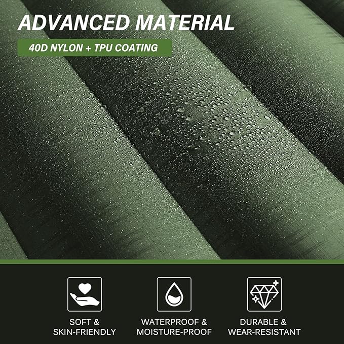 • Camping Grade Material: This sleeping mat is made of 40D nylon coated with TPU coating, providing extreme pressure-bearing. The edge of the camping mat is heat-sealed, so you don't have to worry about air leaks or tears, even under harsh conditions