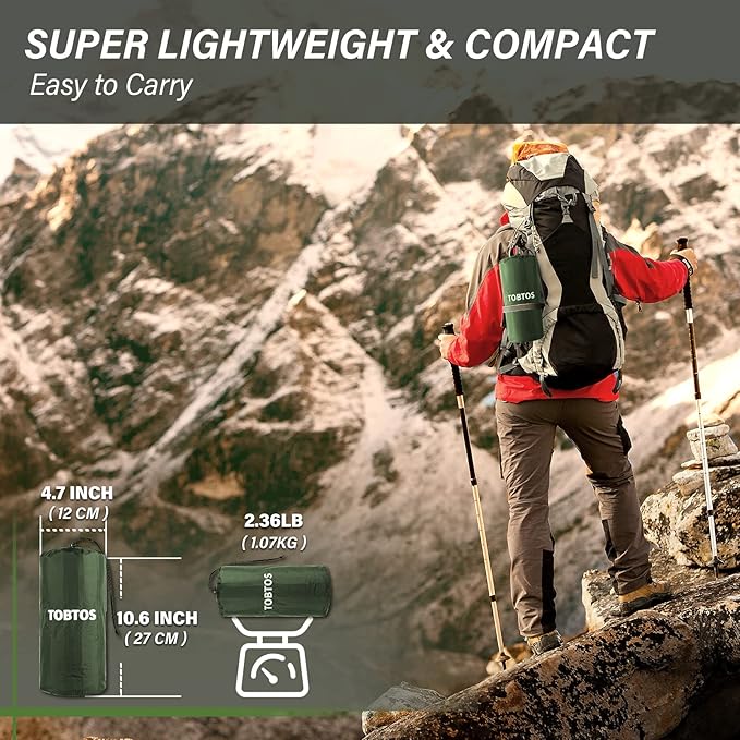 • Extra Thick Camping Pad: TOBTOS sleeping pad is wider and thicker than others on the market. It can be up to 6 in thick once full of air, which is our biggest advantage. It can stay away from the hard ground and sleep comfortably in any sleeping position