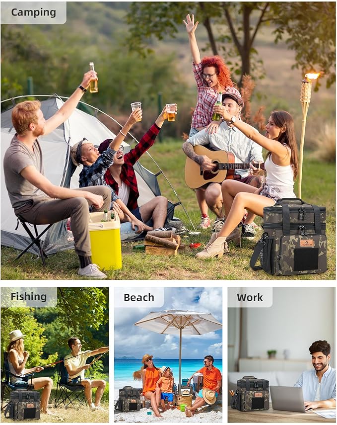 • Large Capacity with Dual Compartment- Maximum size is 15L, fits 24 Cans of soda(330ml). 2 Insulated compartments for different uses, the top compartment of the insulated lunch bag is expandable, increasing the capacity by 4L. Normal size with 12L, handy to use for work, day trips, beaching, picnic, hiking, camping, and so on.