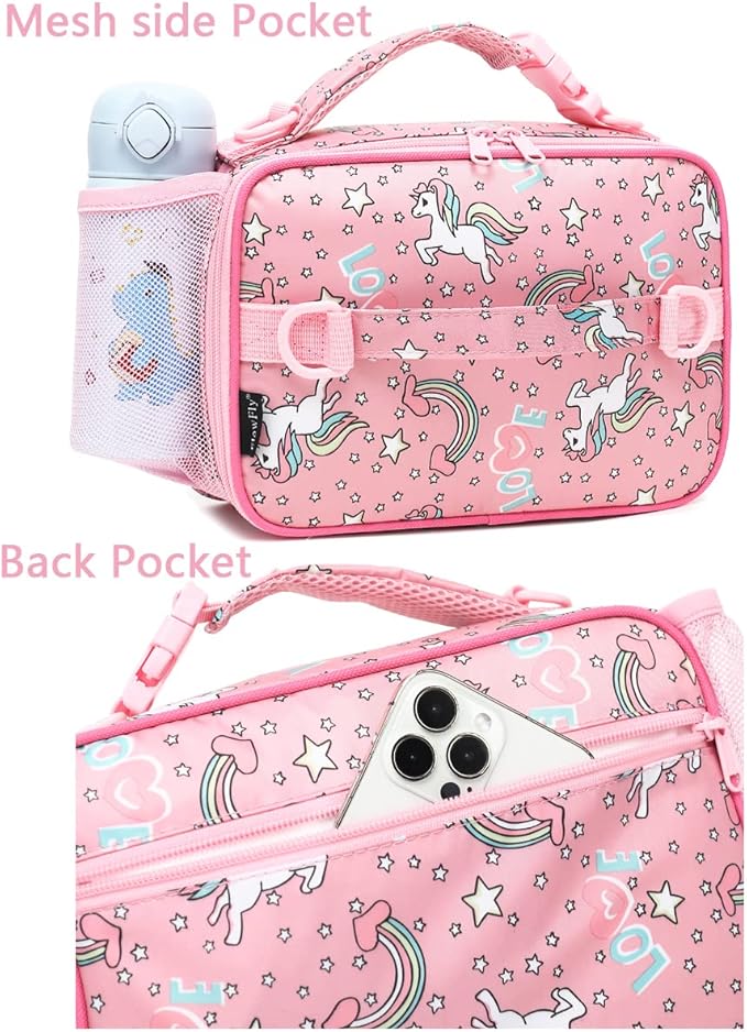 • ✿【Larger Capacity & Extra Storage】Dimension: H: 4.33 x W: 7.7 x L: 10.6 inches, It is lightweight and there is enough capacity to take daily meals and snacks for your kids. The internal mesh pocket is great for holding knives, forks, spoons, napkins, cards, and other small stuff. The side pocket is for your drinks, bottles, and even umbrella.