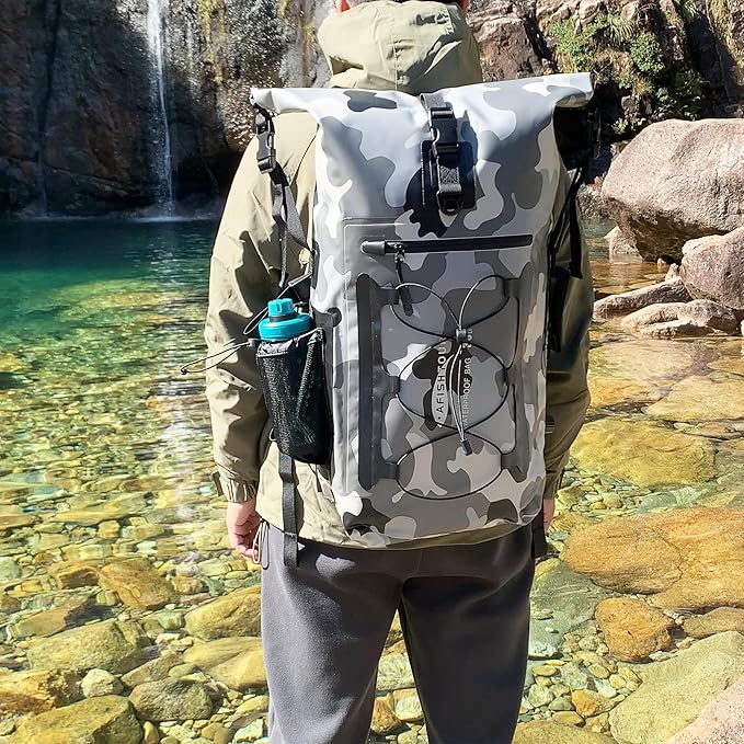 • ROLL-TOP CLOSURE: The roll-top closure system creates a watertight seal by rolling down the top of the backpack and securing it with the buckle. This closure method ensures maximum protection against water infiltration, making it suitable for water activities where the bag may be exposed to splashes or submersion.