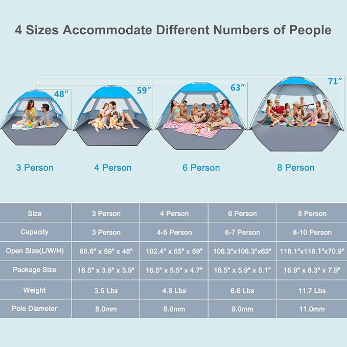 • Super Large Space: Size of 118"L x 118"W x 71"H, 30% bigger than other instant tents at a similar price, fits 8-10 people. It provides a comfortable space for family and friends on the beach