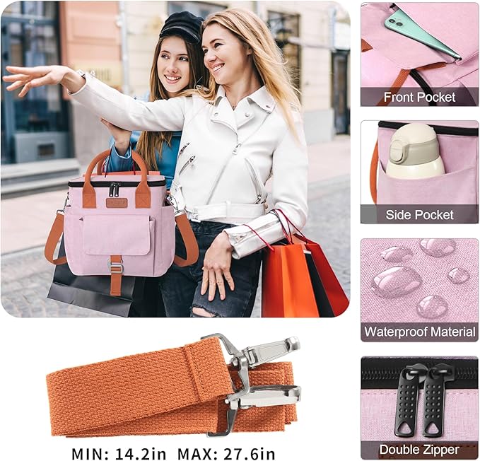 • [CONVENIENT & PORTABLE] The reusable lunch box features one reinforced handle on top and comes with removable and adjustable shoulder straps which can be adjusted from 14" to 27", which provides another carrying option at work with this lunch bag, making it a versatile option that you can carry with your ladies' lunch box to the office, day trips, beach. Stylish and lightweight design is convenient to be used as your lunch bag, cooler bag, picnic bag, sundry bag or shopping bag.