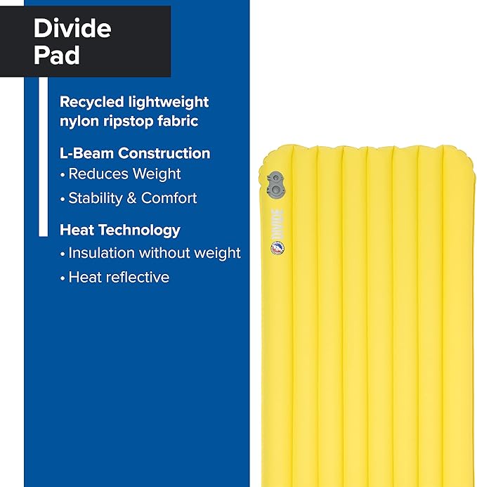 • The Divide pads are designed with a proprietary I-Beam construction that reduces weight and provides consistent stability and comfort. They are 3.25” thick with 3.5” larger outer chambers that keep you comfortably cradled in the middle of the pad. Built of recycled, durable nylon ripstop fabric with aviation grade TPU lamination that provides ultimate weld strength and dependability.