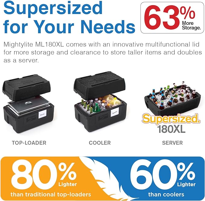 • 63% More Storage: Mightylite ML180XL comes with an innovative multifunctional lid for additional storage and clearance to store taller items. It also doubles as a supersized server for catering and food truck services or a large cooler for BBQ nights with family and friends.
