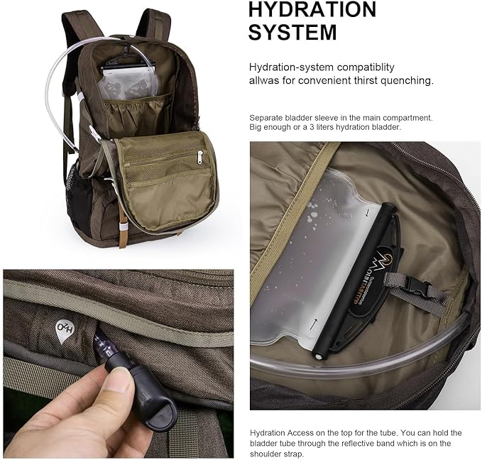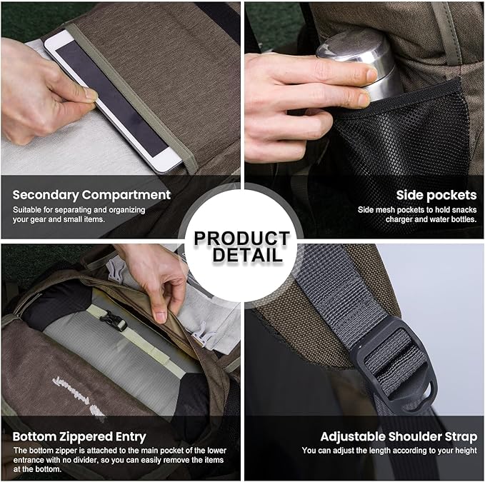• Well-designed details: This outdoor backpack has many clever and convenient designs. The bottom compartment provides direct access to the main compartment; there is also a dedicated compartment for a water bladder (WATER BLADDER NOT INCLUDED), In addition, various shrink straps can also carry camping equipment such as trekking poles, sleeping bags and tents.
