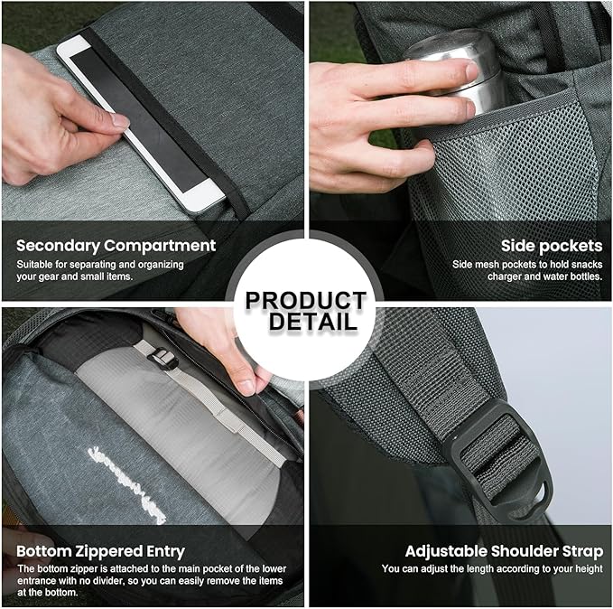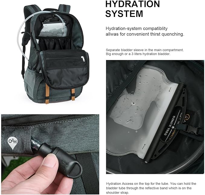 • Well-designed details: This outdoor backpack has many clever and convenient designs. The bottom compartment provides direct access to the main compartment; there is also a dedicated compartment for a water bladder (WATER BLADDER NOT INCLUDED), In addition, various shrink straps can also carry camping equipment such as trekking poles, sleeping bags and tents.