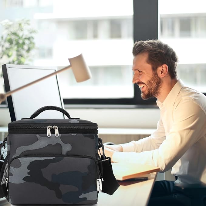 Insulated Reusable Lunch Bag Adult Large Lunch Box for Women and Men with Adjustable Shoulder Strap,Front Zipper Pocket and Dual Large Mesh Side Pockets,Black Camo