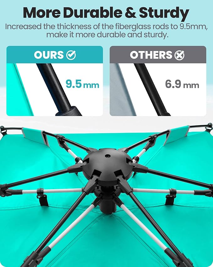 • 9.5MM Thickened Rods & 190T Material: We increased the thickness of the rods from 8.0mm (market standard) to 9.5MM and made with 190T Spring Asia Textile, this beach tent sun shelter is more rugged than other lower ones thus handle the wind firmly and stable without breaking or tearing