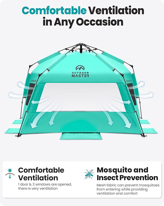 OutdoorMaster Beach Tent with Blackout Shelter Technology, Portable Beach Shade Sun Shelter Canopy for 4-6 Person with UPF 50+ UV Protection, Easy Setup Pop Up Tent Family Size