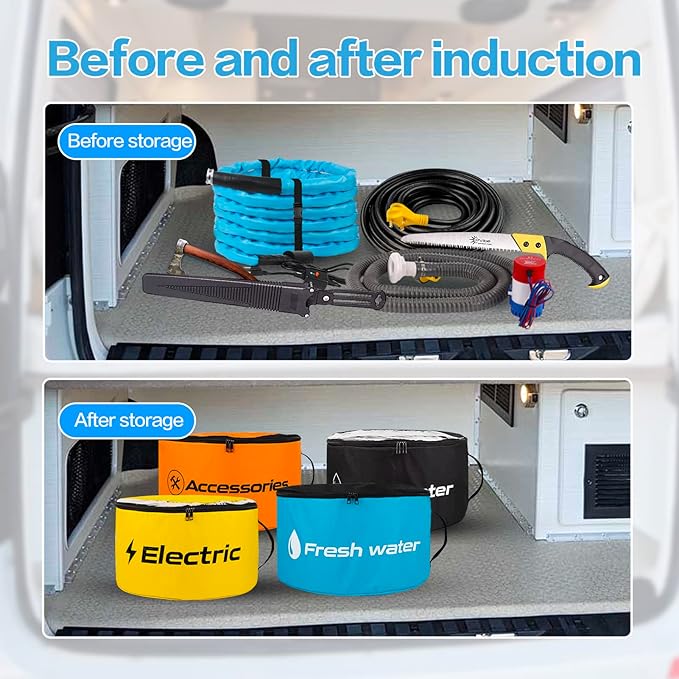 • TARGETED STORAGE AND ORGANIZATION: The electrical bag and sewer hose bag are fully sealed with a transparent PVC cover, allowing you to see what's inside while effectively blocking odors; The water hose bag and accessory bag are vented with a breathable mesh, which allows any excess water or liquid to evaporate, ensuring a mold-free environment for your hoses.