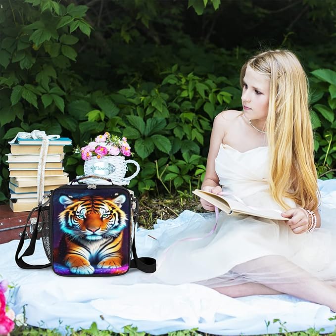 Galaxy Colorful Tiger Insulated Lunch Bag for Girls Boys Teen Cute Tiger Reusable Lunch Box with Shoulder Strap Freezable Thermal Cooler Bag Meal Prep Boxs for School Travel Picnic Beach Lunch Pail