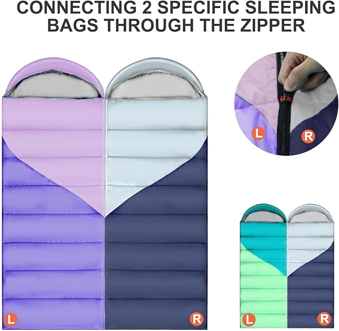 • ROMANTIC DESIGN:The side zipper allows two specific color sleeping bags to be spliced together to form a love heart, becoming a large double sleeping bag for couples, lovers, or sisters. It's the perfect way to make camping romantic and meaningful.