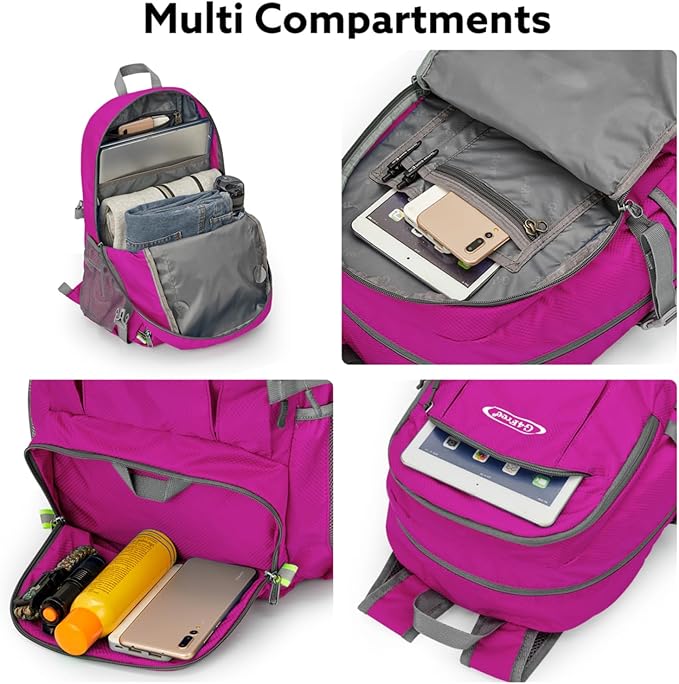 • 【Multi-Compartment Design】 This foldable backpack has 40L storage space. Featuring one main zipped compartment, a second large zipped front pocket, one front zipped hidden pouch, one front zipper compartment, and 2 side pockets. One separator and one small zippered pocket in the main compartment to organize your travel essentials or daily items.