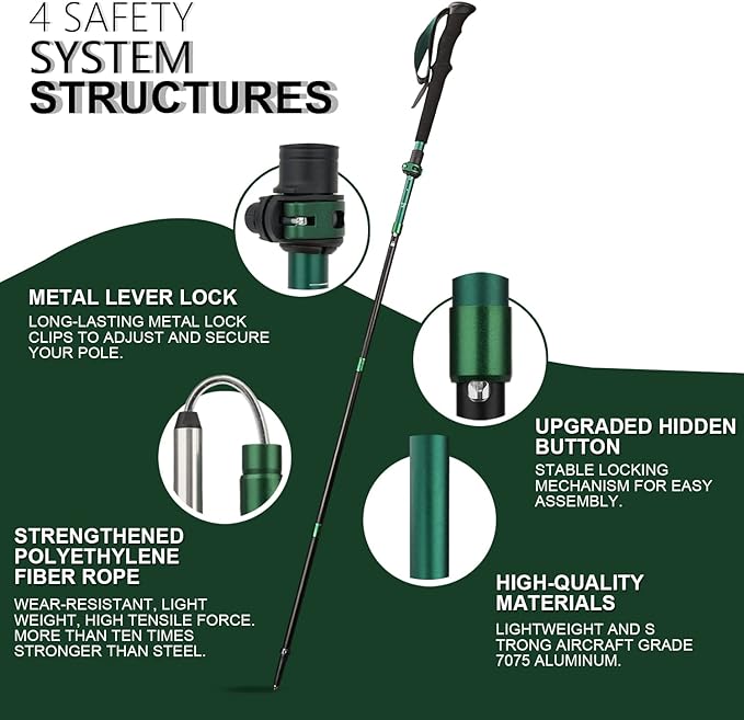• Durable and Worry-free: TheFitLife hiking poles are made of lightweight 7075 aluminum alloy which is commonly used in aviation. It withstands pressure and shock better, in addition, it helps reduce back and knee joint stress. Metal lever lock and hidden button locking mechanism make it stable and secure