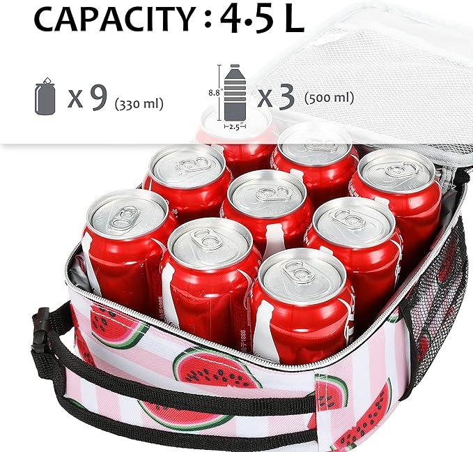 • COMPACT SIZE - 8.5" x 4" x 9.5" (L x W x H). Large enough to hold up to 9 cans of soda (330ml), 1pc most of food container, 3 bottle of water (500ml).