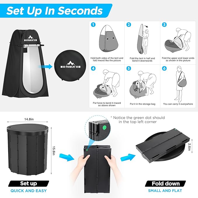 • MULTI-USE POP UP TENT - Empowering you with instant privacy protection! The PANKAY shower tent is 47.2" L x 47,2"W x 74.8" H, provides a private space for using the camp toilet and having a quick shower during outdoor adventures. Also suitable as a changing room and outdoor lounge. The silver coating effectively blocks sunlight and ensures privacy. Constructed with tear-resistant 190T opaque polyester and anti-rust steel flat wire, the camping toilet tents guarantees premium durability.