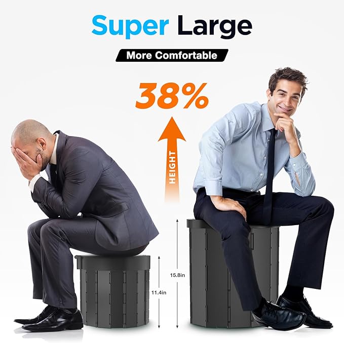 • LARGE PORTABLE TOILET FOR ADULTS - The height of the portable toilet for camping is 15.8” which is 38% higher than old version and most other collapsible toilets. Wider seat cover for more comfortable sitting. The porta potty can set up in seconds and safely holds up to 400 lbs on stable ground. Constructed from waterproof ABS plastics, easy clean up. It is ideal for people dealing with IBS or Crohn’s disease, as its portable design gives you the freedom to go anywhere.