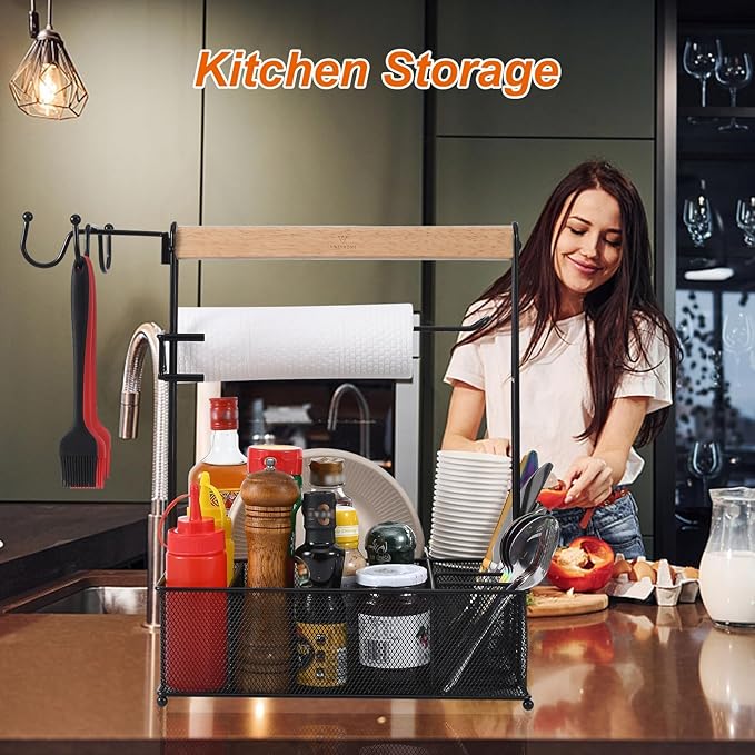 • CONVENIENT AND SPACIOUS - The extra large capacity grill caddy is a must-have for anyone who enjoys outdoor activities such as camping, grilling, picnics, and more. With 7 compartments, a paper towel roll holder, and 3 hanging hooks, it can easily hold all of your barbecue accessories, picnic supplies, camping gear, tailgating accessories, and cleaning products, making your travel much easier.e to your outdoor table eating area!