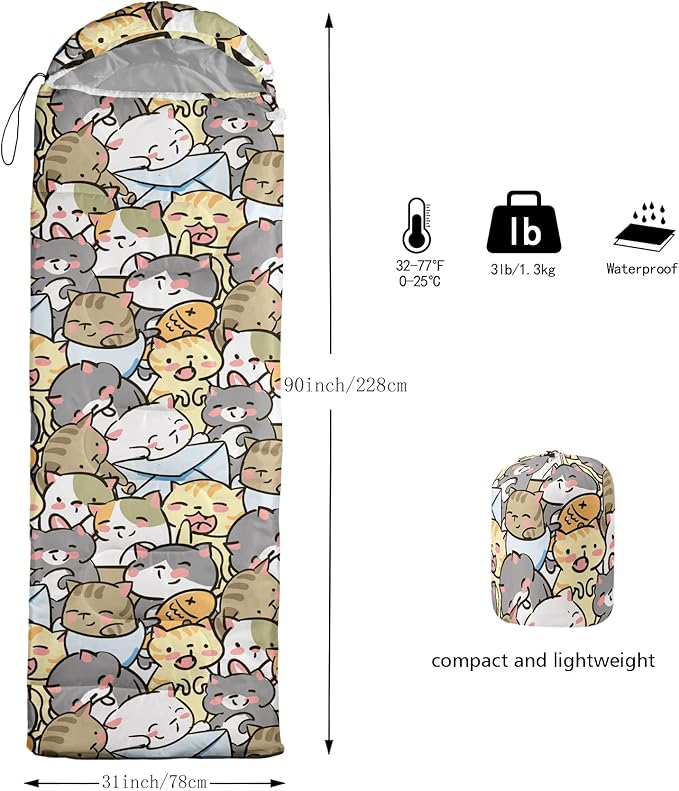 • 【Fits For 3 Seasons】: Size - 31 by 90 inches (W x D). Our sleeping bag can be used in 3 seasons with a design temperature of 32℉-77℉(0℃-32℃). These bags also have a weather resistant waterproof design to keep you warm and prevent you from any dampness.
