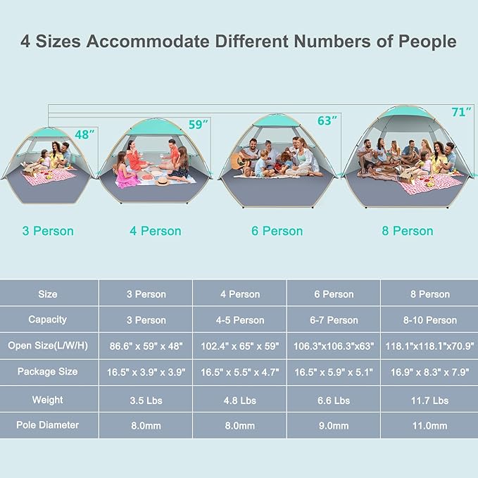 • Super Large Space: Size of 106.3"L x 106.3"W x 63"H, 30% bigger than other POP-UP tent at similar price, fits 6-7 person. It provides a comfortable space for family and friends on the beach