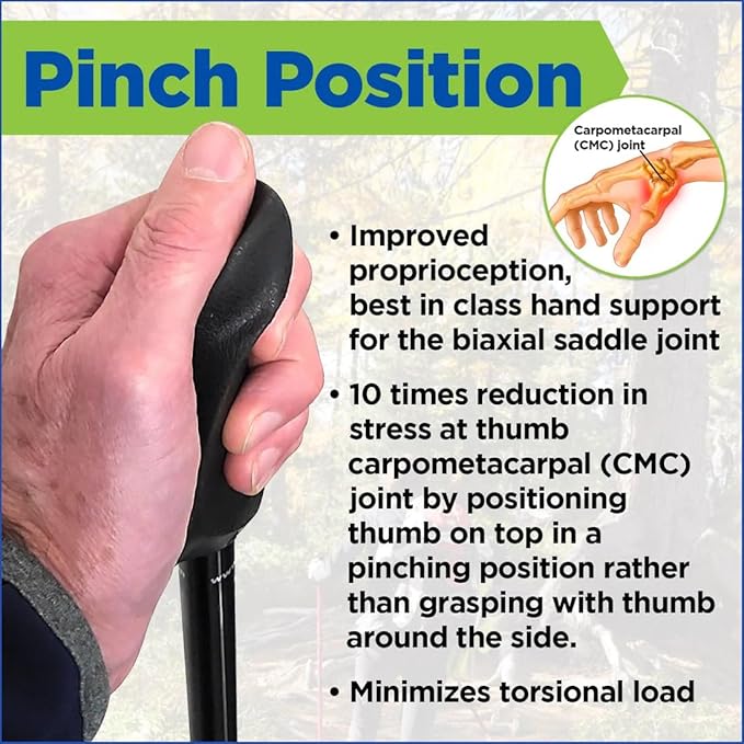• HIGH QUALITY WALKING POLES: 2 pack of adjustable walking / hiking / rehab poles with a patented contoured grip and dual support zones, designed to provide better balance and stability. Perfect for pole walking for seniors, our patented grips provide a 10 times reduction in stress at thumb carpometacarpal (CMC) joint by positioning thumb on top in a pinching position rather than grasping with thumb around the side.