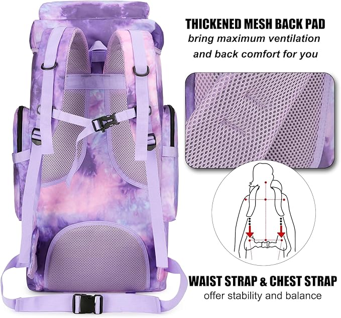 • 【Hiking Backpack Structure】: The 70L camping backpack main compartment is drawstring closed, hiking backpack roomy enough for you storage hiking gear, shoes and luggage, 1 laptop compartment, 1 front zipper pocket and 2 side pocket for separate and orderly storage.