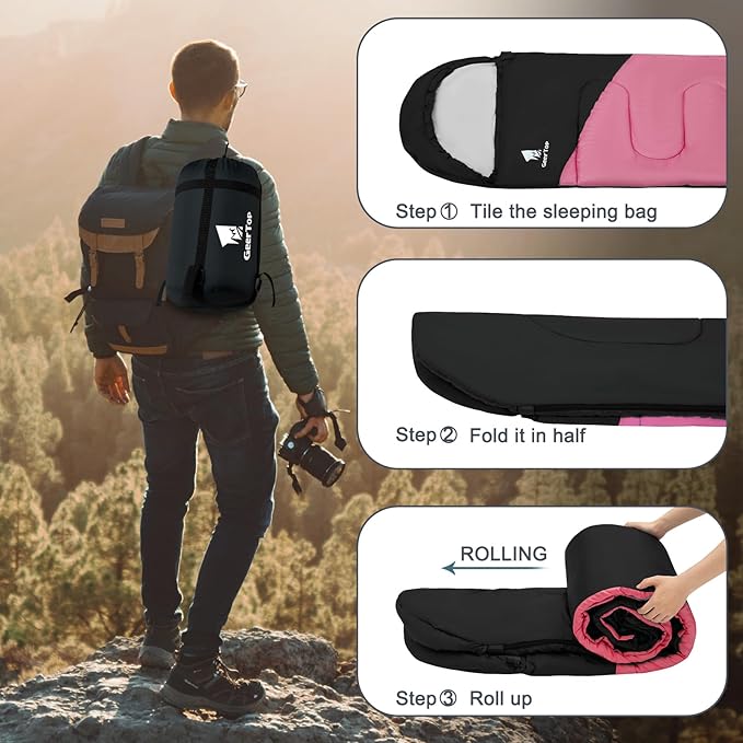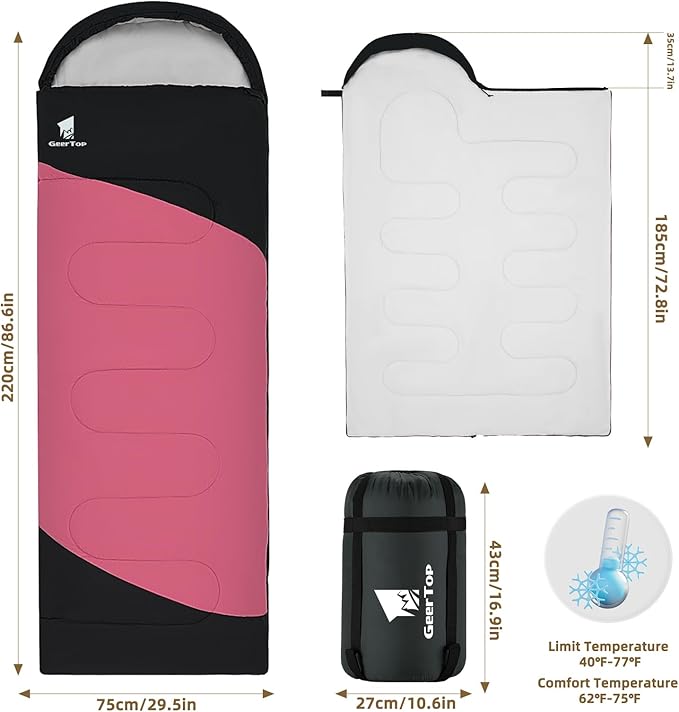 • 【Sleeping Bag for Adults and Kids】Using size - 86.5‘’(L) x 29.5" (W) , comfortable sleeping bag size for adults, and it is spacious for kids or teenagers. Enjoy a good night's sleep with this sleeping bag in your camping trip. Comfort temperature is 62°F - 75°F. Limit temperature is 40°F - 77°F.