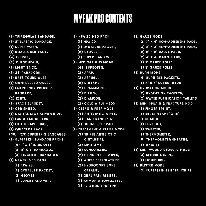• Comprehensive 140 Item PRO Ifak Kit: The MyFAK pro is a comprehensive and compact first aid kit designed to provide you with everything you need to save a life. Equipped with a tourniquet, emergency pressue bandage, compressed gauze and more. See video for full details.