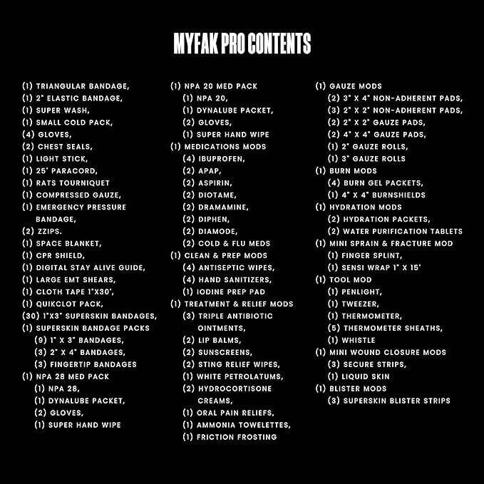 • Comprehensive 140 Item PRO Ifak Kit: The MyFAK pro is a comprehensive and compact first aid kit designed to provide you with everything you need to save a life. Equipped with a tourniquet, emergency pressue bandage, compressed gauze and more. See video for full details.