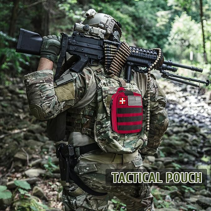 • 【Compatible and Portable】 The military grade MOLLE medical pouch is made of 1000D nylon, which is lightweight and waterproof. Inside the bag, there are three large compartments and several straps, all survival gear and equipment are stored in an organized and easy-to-find manner, making it easy to locate necessary items in an emergency situation. The MOLLE system on the back also allows you to easily attach the kit to your tactical vest, backpack, or belt.