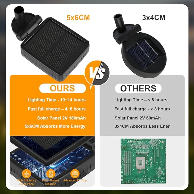 • 【Waterproof, Lighting Up More Time 8 LEDs Solar Ourdoor Lights】 With an IP65 waterproof rating, the solar lights outdoor decro are specially designed to withstand bad weather conditions, no more worry about rain, snow, frost, or sleet. The 600mAh high-capacity rechargeable battery lasts longer than other LED solar patio lights. The outdoor solar lights can light up for 10-12 hours during all night after a 6-8 hours solar charged in day even if it is a cloudy or rainy day.
