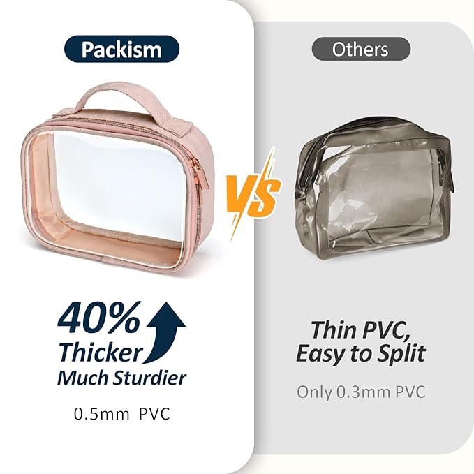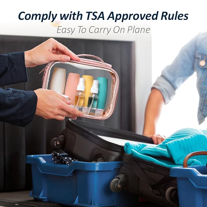 • TSA Approved, Meet Liquids Rule: This 7.8 x 2.3 x 5.9 inch clear makeup bag follows the 3-1-1 Liquid Rule of airlines. Come with TSA Approved Travel Size Bottles Set. This set of travel accessories brings you unobstructed boarding. You can quickly pass the airport security screening