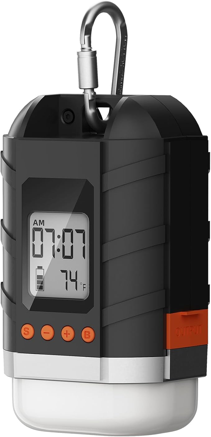 • 【7-in-1 Multifunction】This rechargeable mini camping lamp with functions such as lighting, time, temperature, power, power bank, SOS, hanging hook. At minimum brightness, the operating time is well over 500 hours, the energy consumption is low, the service life is long and the USB-C charging port is available.