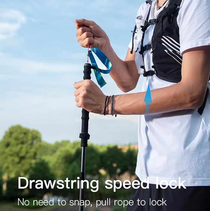 • 【Quick-Lock Technology】Collapsible hiking poles use quick-lock technology, you can easily adjust it and lock them in place takes only a few seconds. The sturdy locks are designed to firmly keep the walking poles in place and prevent them from sliding down, offering you the ultimate stability.