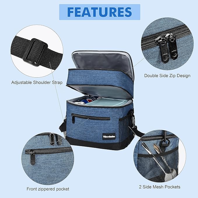 • Large Capacity Double Layer Lunch Box - This unisex insulated bag comes with 2 thermal compartments, which can be used for different purposes and separate hot and cold food, drinks, beverages, etc. The reusable lunch bag measures 9.85*8.72*10.63 inches and has a high capacity of up to 17L. Additionally, it features mesh pockets on both sides and a front zipper pocket, making it easy to store all the lunches or picnic essentials you need.
