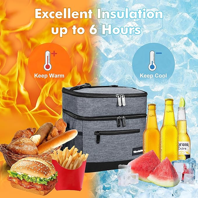 • Large Capacity Double Layer Lunch Box - This unisex insulated bag comes with 2 thermal compartments, which can be used for different purposes and separate hot and cold food, drinks, beverages, etc. The reusable lunch bag measures 9.85*8.72*10.63 inches and has a high capacity of up to 17L. Additionally, it features mesh pockets on both sides and a front zipper pocket, making it easy to store all the lunches or picnic essentials you need.