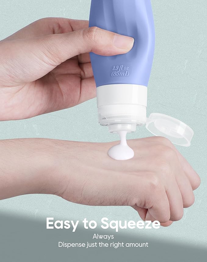 • SAFE SILICONE MATERIAL: Made of Food Grade BPA Free Silicone, this travel set is sturdy, soft, squeezable, flexible and reusable. Safe material guarantee that you can not only use them to store shampoo, conditioner, face soap, sunscreen, creams, lotion or etc, but also safe for food, various seasonings. Soft silicone body make you squeeze out contents easily
