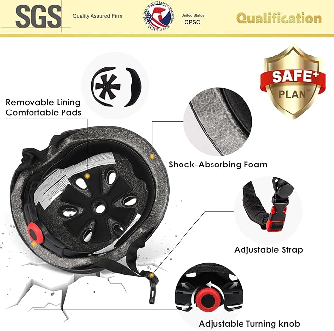• ⭐Safe+ Plan ⭐Safe+ Plan promises that every helmet is made with 100% ABS strong shell, 100% EPS shock-absorbing foam, and sweat absorption nylon removable pads. Premium material ensure both safety for every playing and comfortable for every inch of delicate flesh. Plus, Safe+ Plan has passed various environmental tests to simulate falling and crashing. The warrior never escapes but provides protection for kid's head when an emergency happens(Properly Wearing).